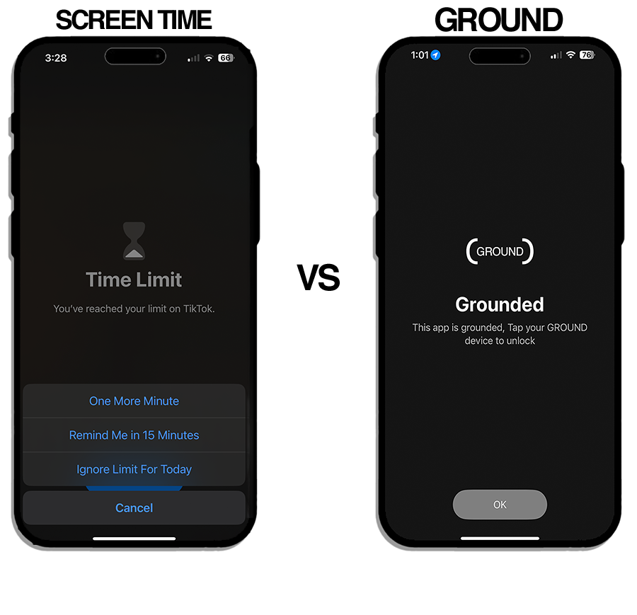 Screen time makes the "key" to get back in the app easily accessible. With Ground, you can leave the key behind, which keeps your phone distraction-free while you're out.